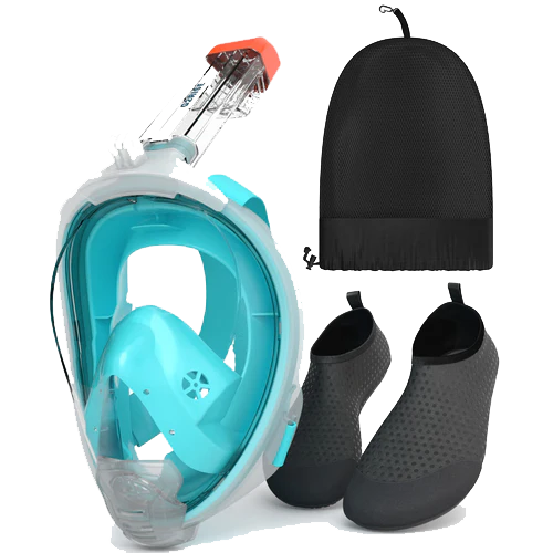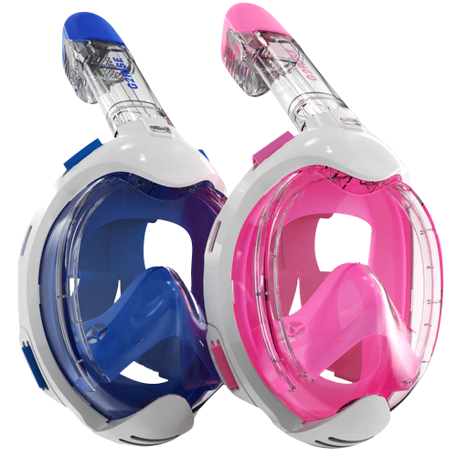 Durable tempered glass mask, dry top snorkel, and adjustable fit — made for snorkeling, diving, and swimming.