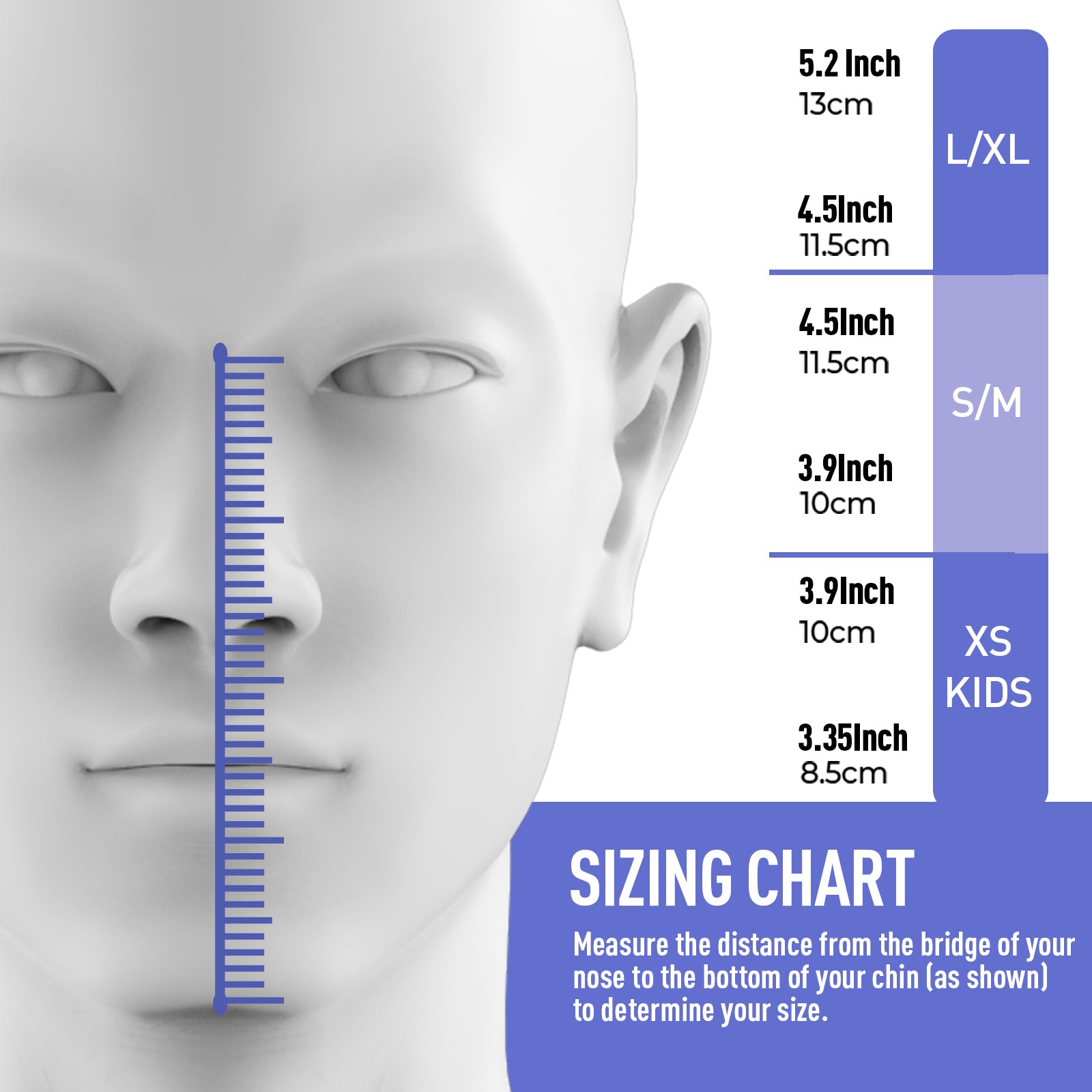 To determine your size, measure the distance from the bridge of your nose to the bottom of your chin (as shown).