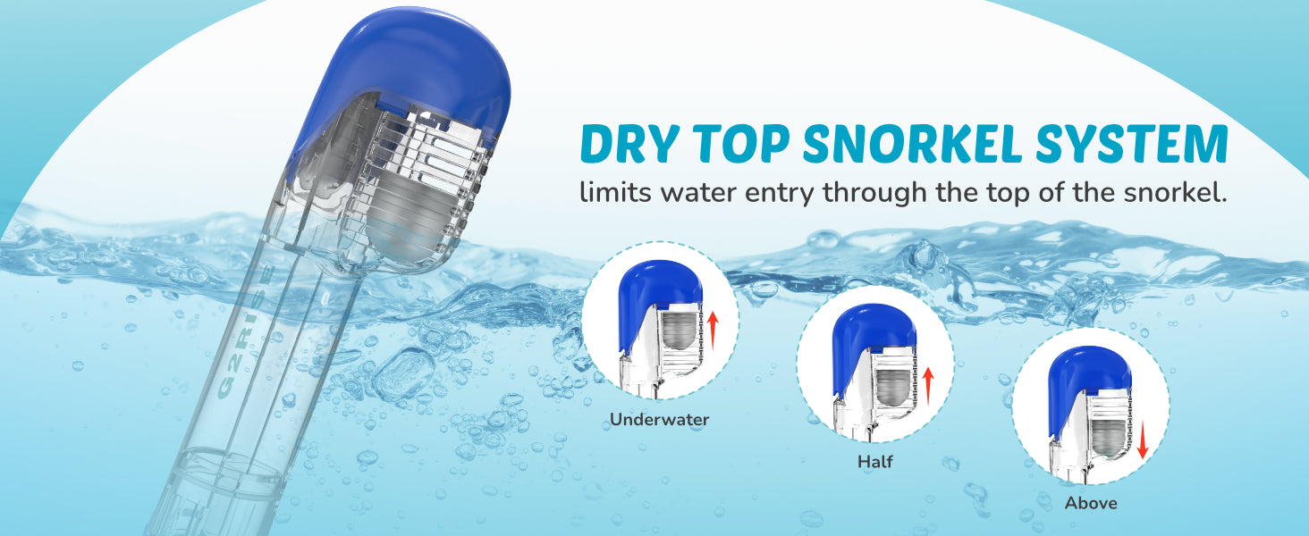 The upgraded G2RISE snorkeling mask features a larger breathing chamber and two intake valves that ensure smooth airflow while preventing water from entering the mask. This enhanced design provides a secure seal, allowing air to circulate freely and reducing the risk of leaks, ensuring a comfortable and dry snorkeling experience.